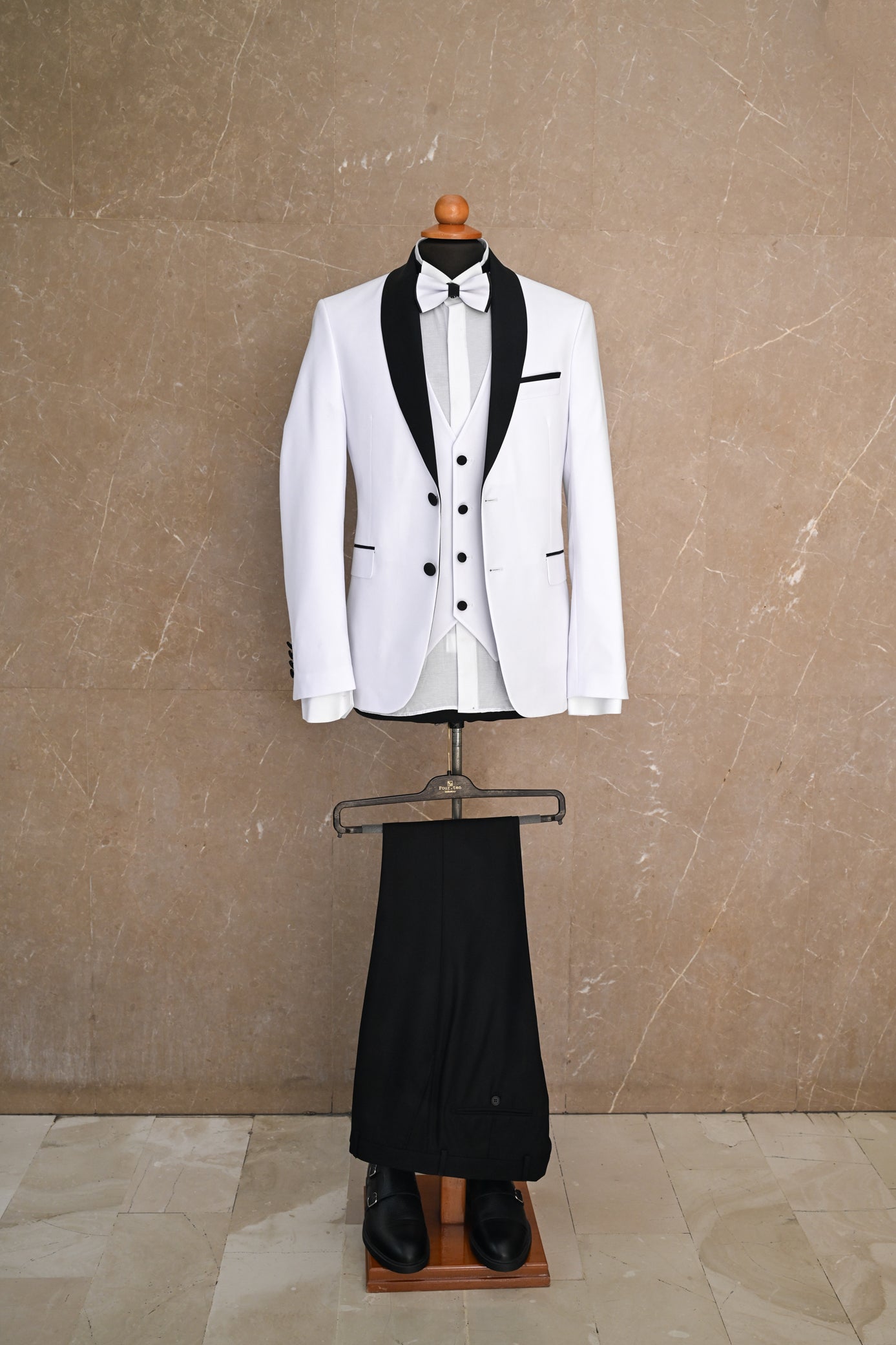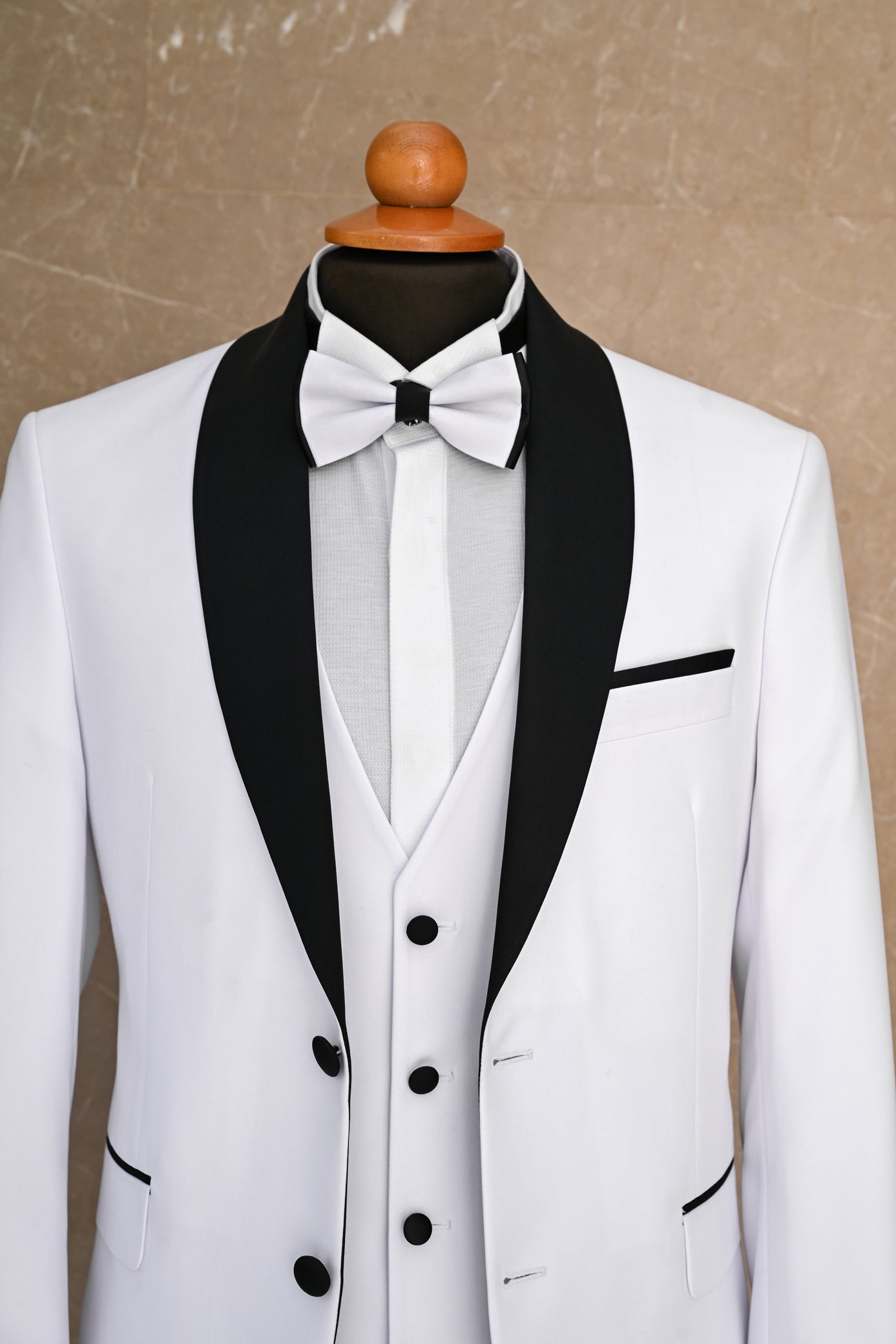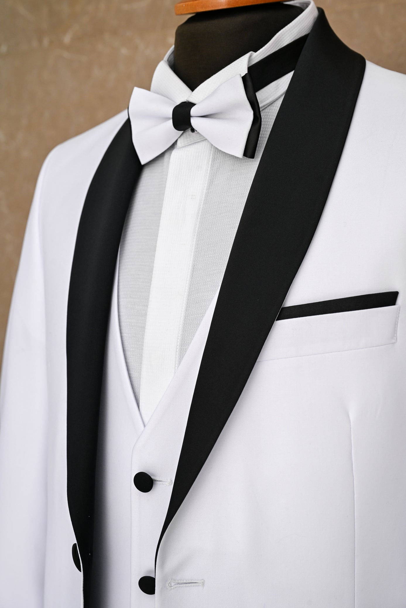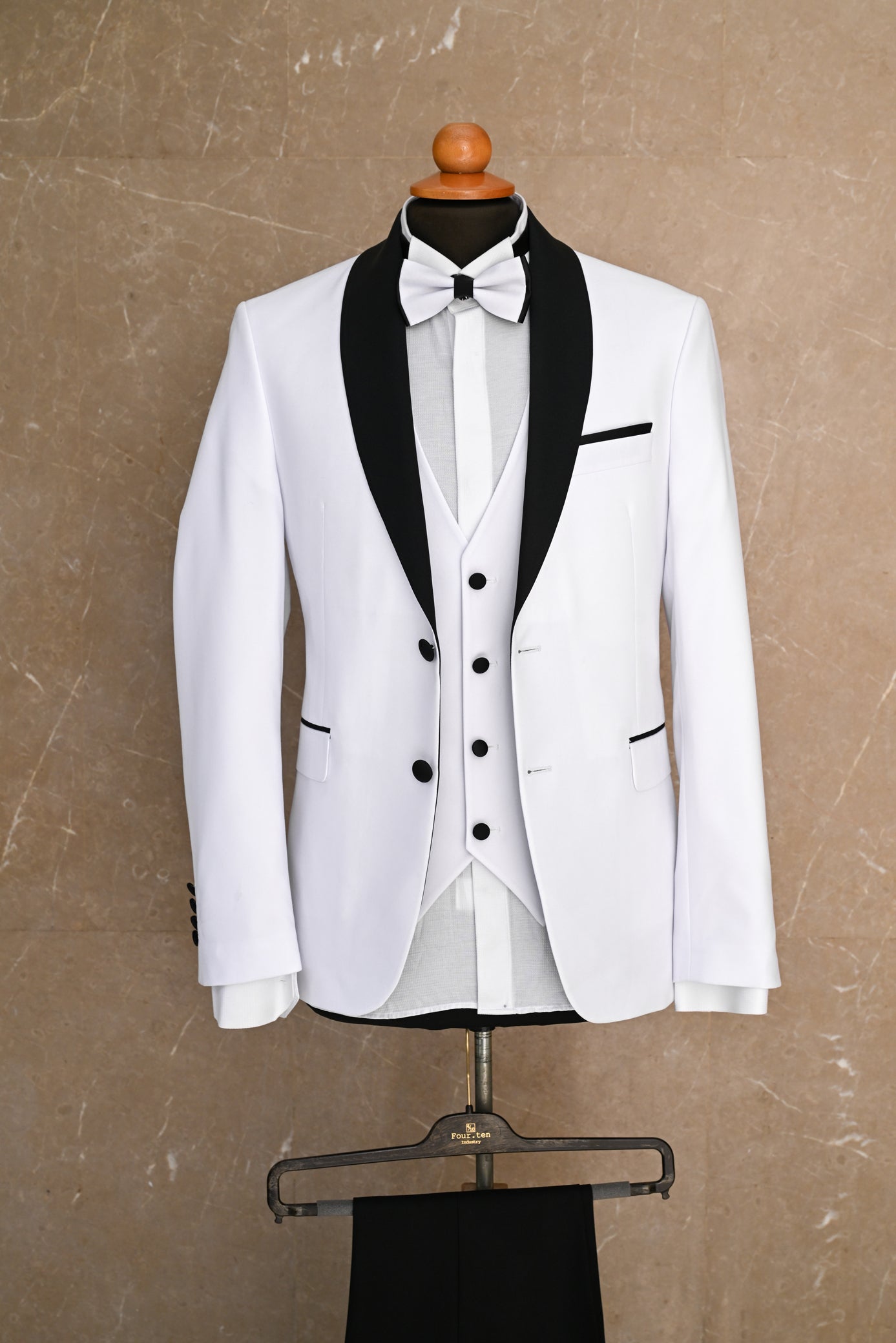 Αυτό το λευκό tuxedo με μαύρο σατέν πέτο και λεπτομέρειες είναι σχεδιασμένο για άντρες που δεν περνούν απαρατήρητοι.