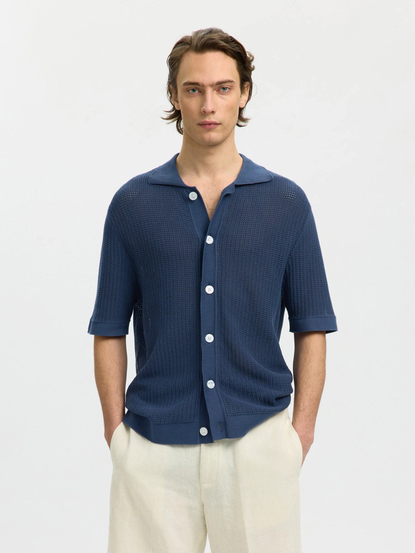 Κοντομάνικο πλεκτό πουκάμισο σε βαθιά μπλε απόχρωση, με διάτρητη υφή που προσφέρει ανάλαφρη αίσθηση και σύγχρονη αισθητική. Ο συνδυασμός της πλεκτής κατασκευής με το button-up design δημιουργεί ένα κομμάτι που κινείται ανάμεσα στο shirt και το knitwear. Ιδανικό για κομψές καλοκαιρινές εμφανίσεις με ιδιαίτερο χαρακτήρα.