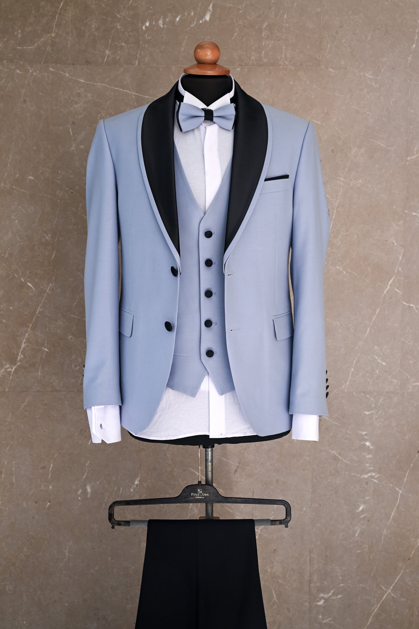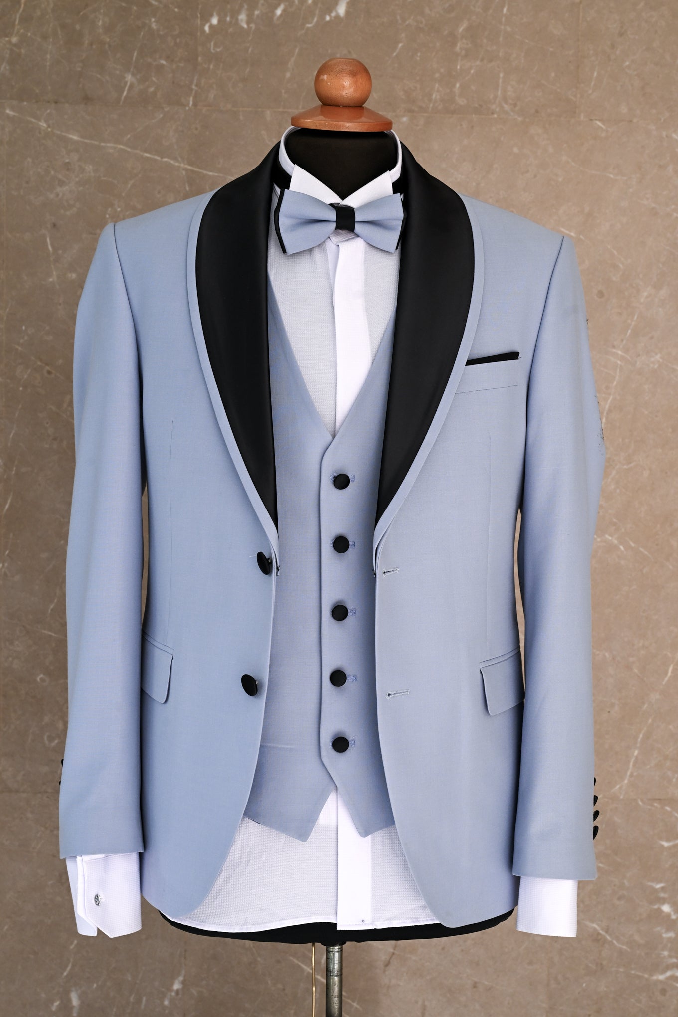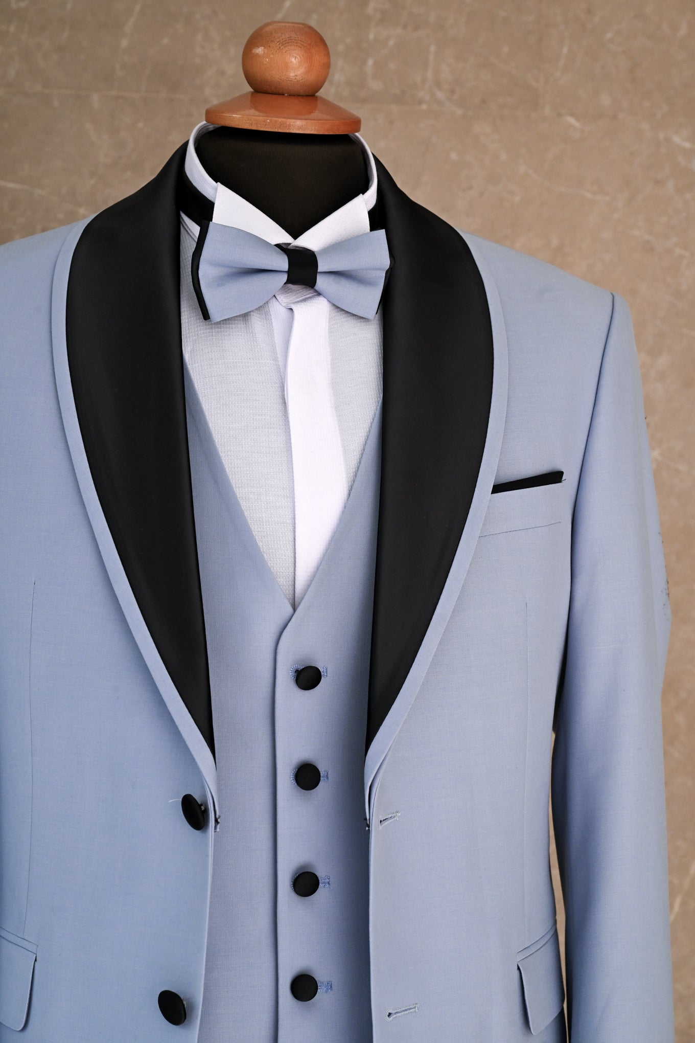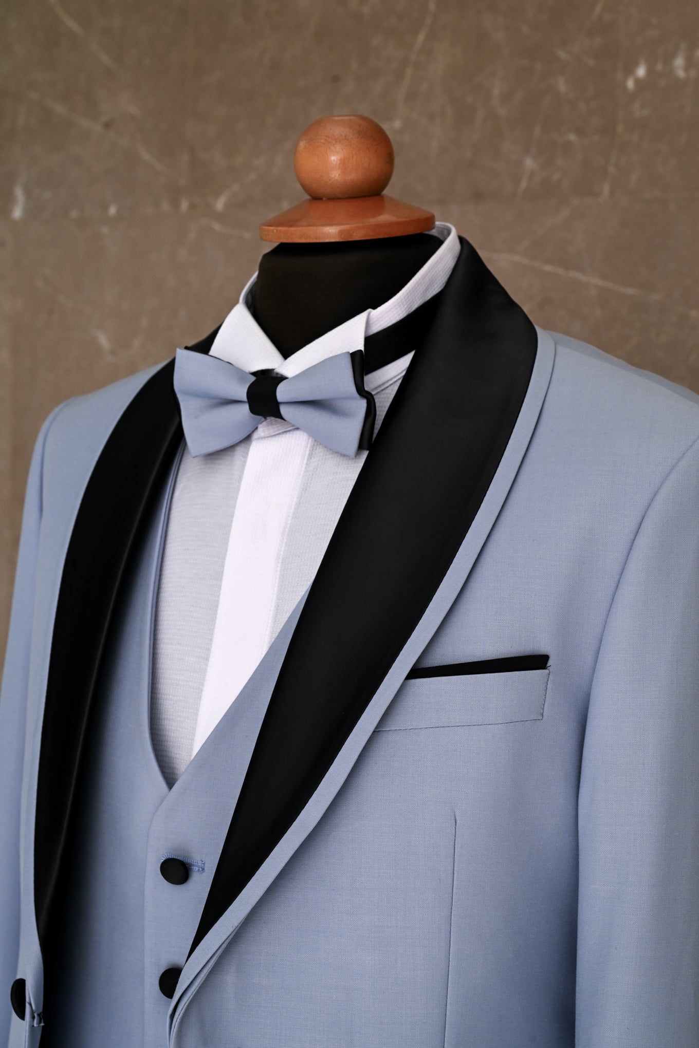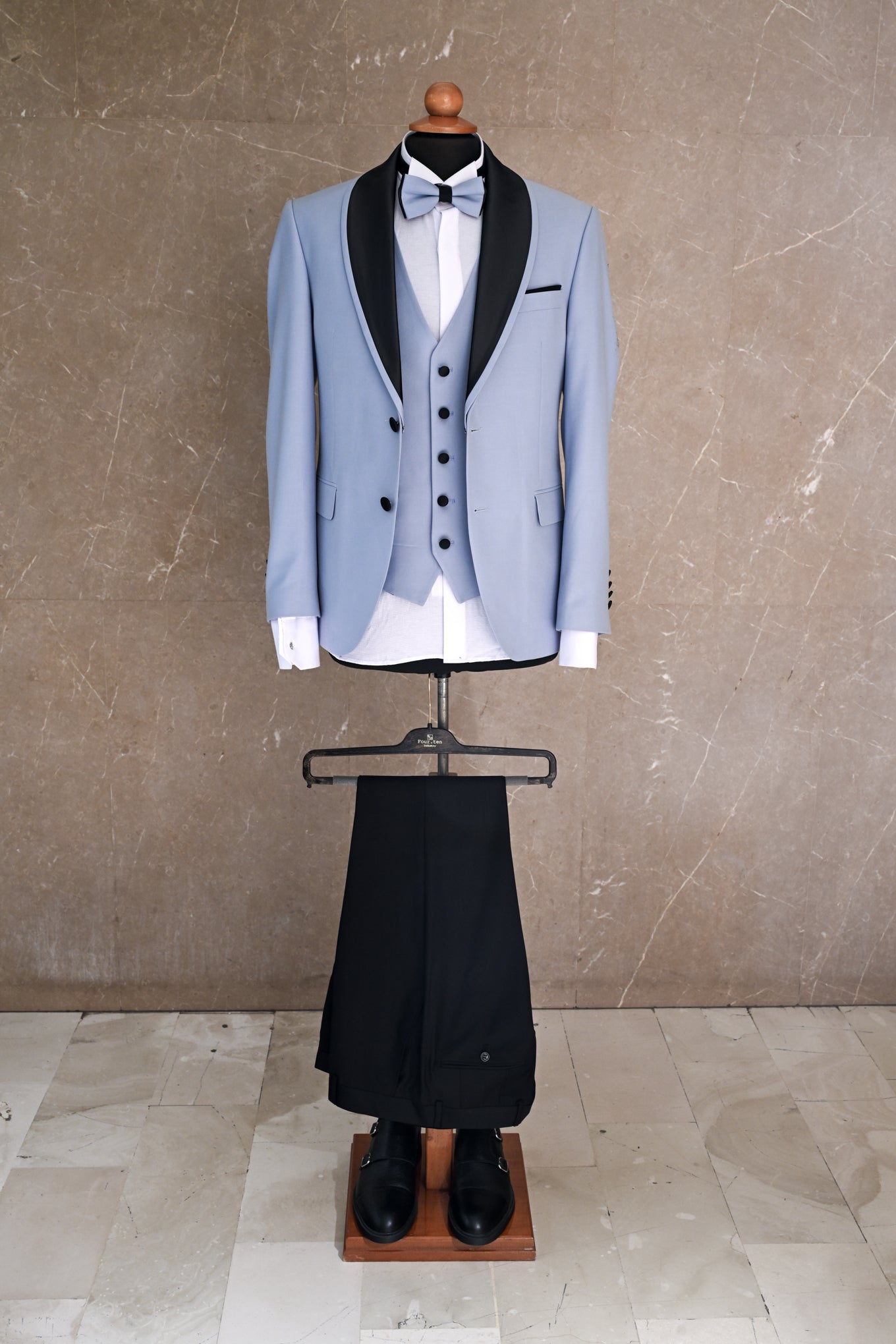 Το γαλάζιο tuxedo με μαύρες λεπτομέρειες είναι η απόλυτη επιλογή για τον άντρα που τολμάει να ξεχωρίσει — με γούστο και αυτοπεποίθηση.